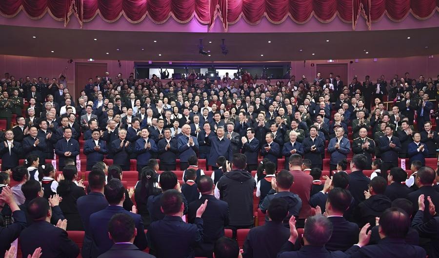 王沪宁、蔡奇、李干杰、何立峰、张国清、王小洪、洛桑江村、胡春华和张升民,在西藏工作过的老同志,以及中央和国家机关有关部门负责同志、中央代表团全体成员一同观看演出。
