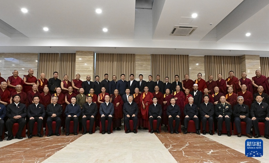 8月20日下午,中共中央总书记、国家主席、中央军委主席习近平在拉萨亲切接见西藏自治区宗教界爱国人士和寺管会干部代表,并同大家合影留念。新华社记者 李响 摄