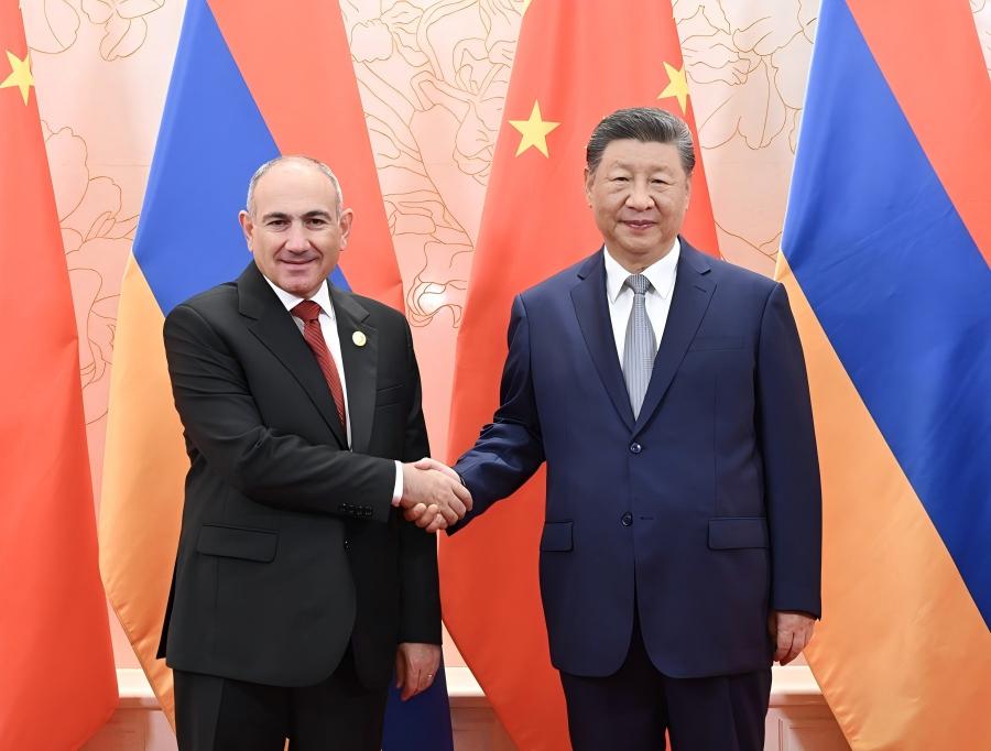 8月31日上午,国家主席习近平在天津迎宾馆会见来华出席2025年上海合作组织峰会和纪念中国人民抗日战争暨世界反法西斯战争胜利80周年活动的亚美尼亚总理帕什尼扬。新华社记者 谢环驰 摄