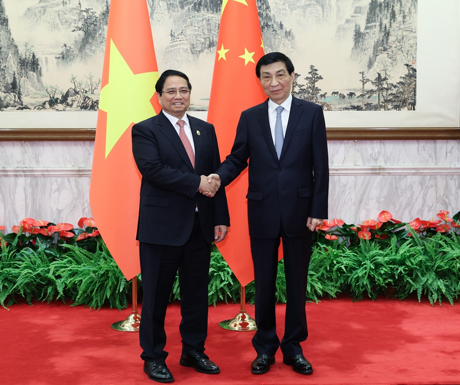 9月1日,全国政协主席王沪宁在北京会见来华出席2025年上海合作组织峰会的越南总理范明政。新华社记者 王晔 摄