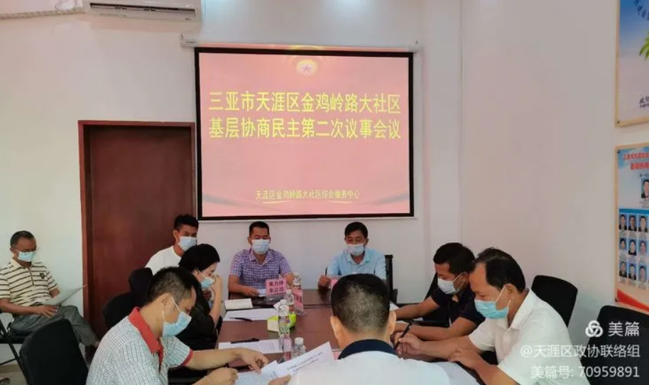 9月28日上午,天涯区金鸡岭路大社区综合服务中心召开2021年基层协商民主 议事会第二次会议,市政协文化文史和学习委员会主任梁定会到会观摩指导。会议由金鸡岭大社区党委书记、主任蔡佐军主持,市政协下沉委员、区城投公司、机场路社区居民委会及群众代表出席。
