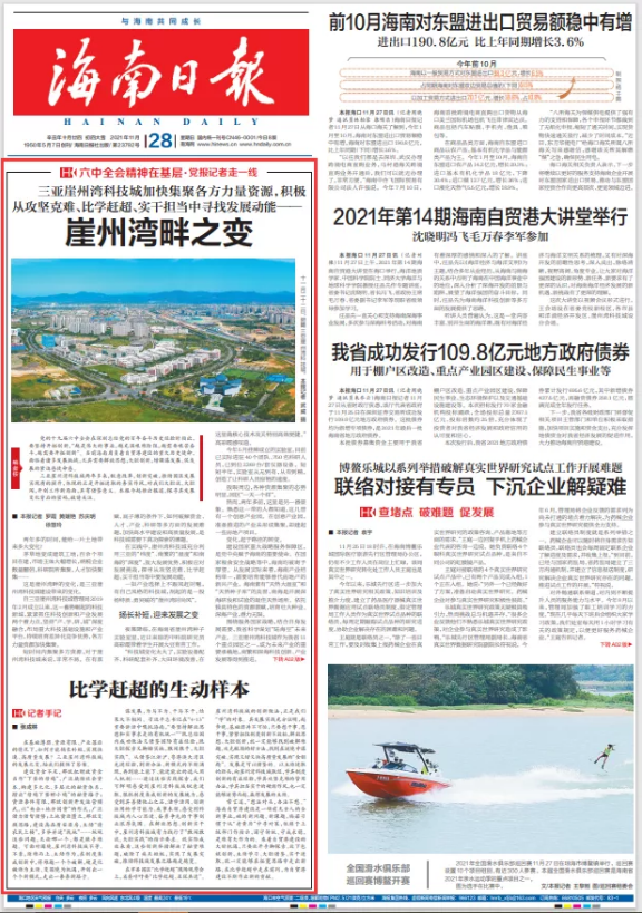 11月28日,《海南日报》头版头条报道《三亚崖州湾科技城加快集聚各方力量资源,积极从攻坚克难、比学赶超、实干担当中寻找发展动能—— 崖州湾畔之变 》,探寻其发展变化背后的密码。详情↓