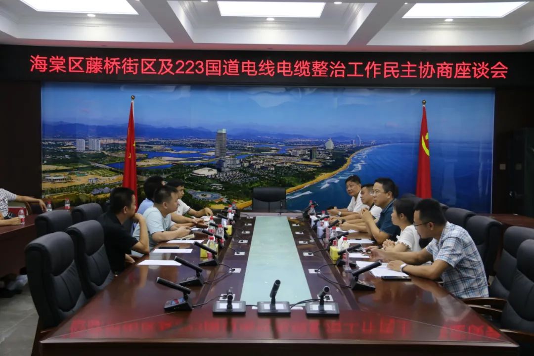 为进一步推进藤桥街区和223国道电线电缆整治工作,继本周一召开座谈会后,5月25日,区政协党组书记、主席聂磊组织召开藤桥街区及223国道电线电缆整治工作民主协商第二场座谈会,区教育局(科工信局),区住建局,海棠湾开发公司,中国电信、中国移动、中国联通和中国有线等四大运营商的三亚分公司负责同志参加会议。