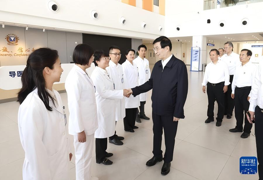 7月7日至9日,第十次全国对口支援新疆工作会议在新疆和田召开。中共中央政治局常委、全国政协主席王沪宁出席并讲话。在新疆期间,王沪宁还到阿克苏、和田和兵团第一师阿拉尔市、第十四师昆玉市等地调研,看望援疆干部人才和基层群众。这是7月7日,王沪宁在浙大邵逸夫阿拉尔医院同援疆医疗人才代表交流。新华社记者 庞兴雷 摄