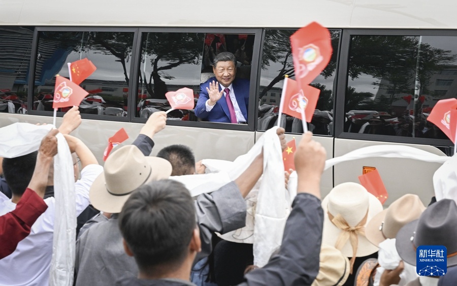 充满节日氛围的古城拉萨,从机场到住地主要街道两旁彩旗舞动,各族群众手持红旗、捧着哈达,齐声欢呼,表达欢迎和感激之情。习近平打开车窗,向沿途群众频频挥手致意。